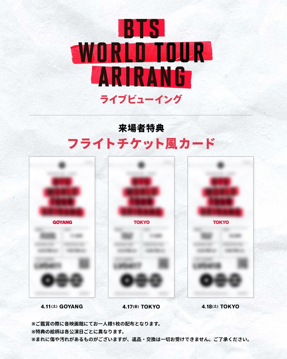 いよいよ今週末に開催される『BTS WORLD TOUR 'ARIRANG' IN JAPAN』。4月17日(金)公演のライブビューイングチケットは、劇場窓口での販売が決定いたしました!