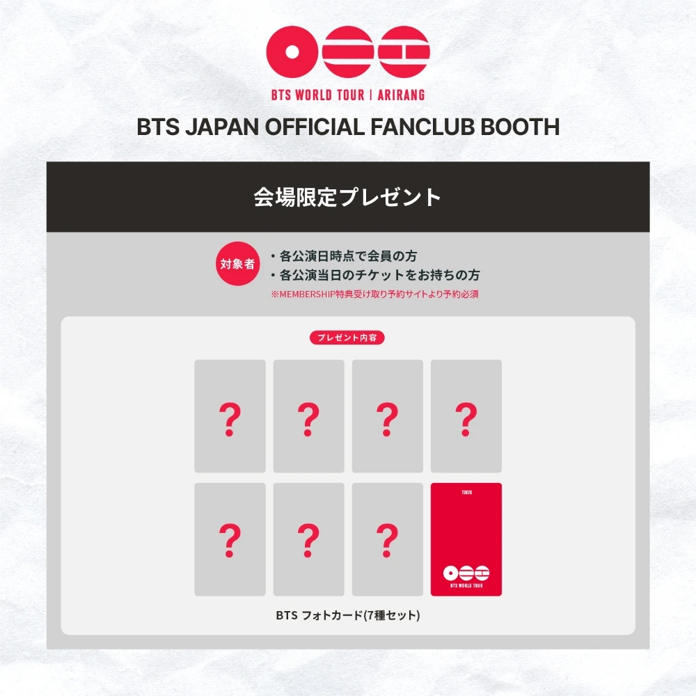 ※『BTS WORLD TOUR 'ARIRANG' IN JAPAN』BTS JAPAN OFFICIAL FANCLUBブース企画詳細はこちらを確認ください。お時間に余裕をもってご来場ください。