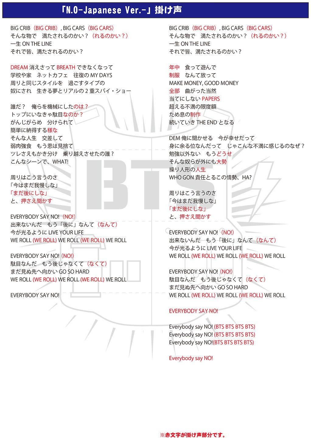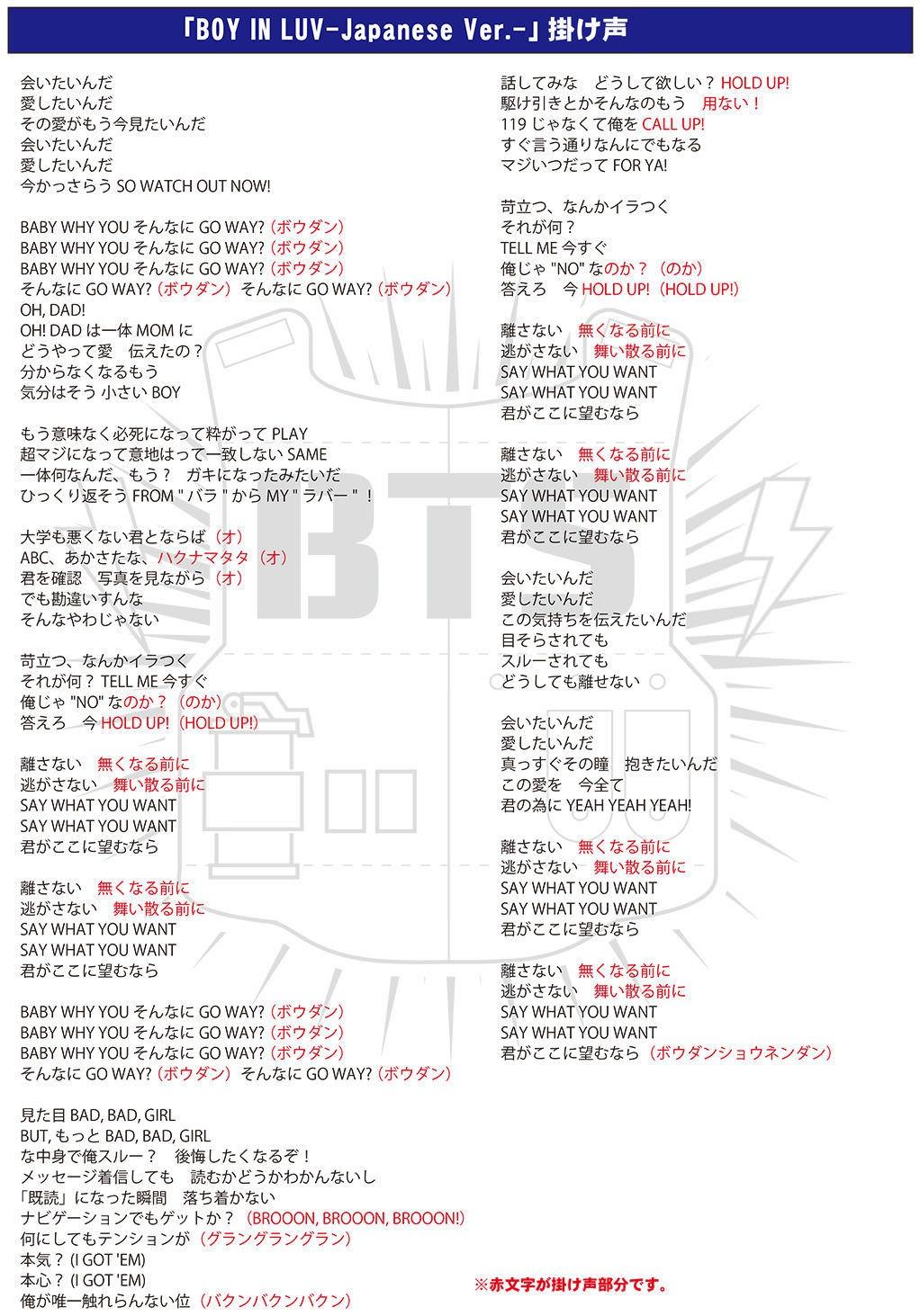 「BOY IN LUV-Japanese Ver.-」 、「N.O-Japanese Ver.-」、「JUST ONE DAY-Japanese Ver.-」の応援方法(掛け声)