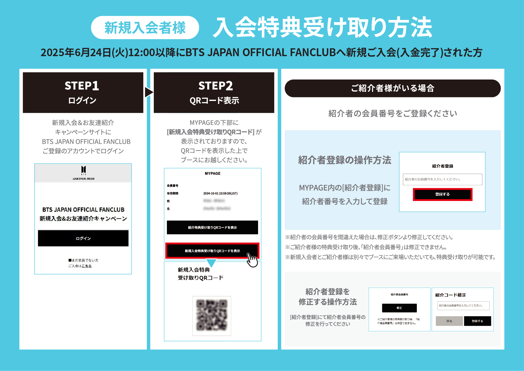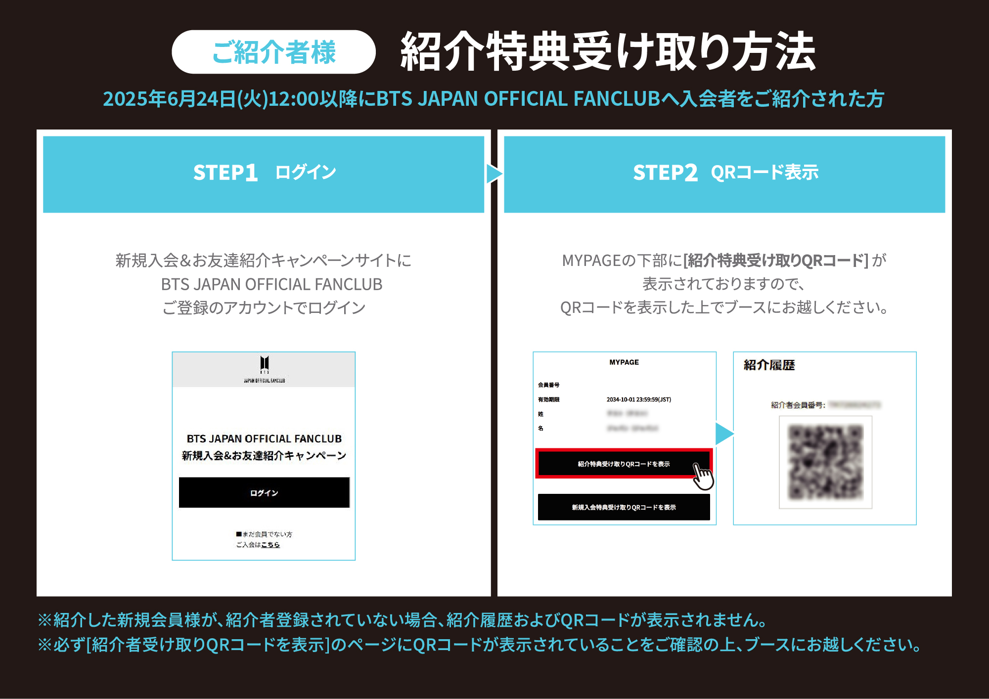 対象期間内にBTS JAPAN OFFICIAL FANCLUBへ入会者を紹介してくださった会員様で、特典受取当日に有効会員である方